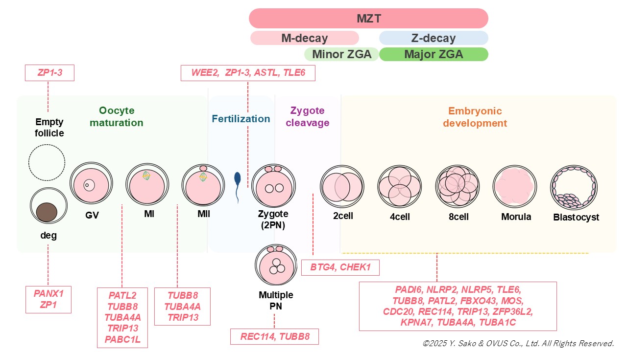 これらは総称してOZEMA(Oocyte/Zygote/Embryo Maturation Arrest)と呼ばれ、近年、OMIM(Online Mendelian Inheritance in Man)に複数の責任遺伝子が登録されています(図参照)。