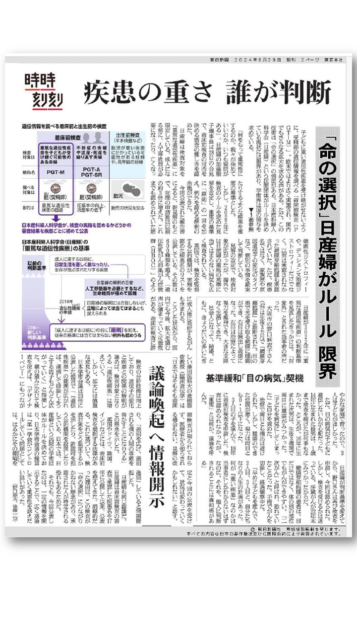 朝日新聞にコメントが掲載されました 日産婦は、2023年8月28日に、2023年に申請されたPGT-Mの全症例の疾患名と数、承認・非承認の結果を公表しました。2023年に見解が改訂され、少し対象疾患の幅が広がったことがみてとれます。倉橋教授が取材に対してコメントされた記事が翌日の朝日新聞の全国版の1面に掲載されました。