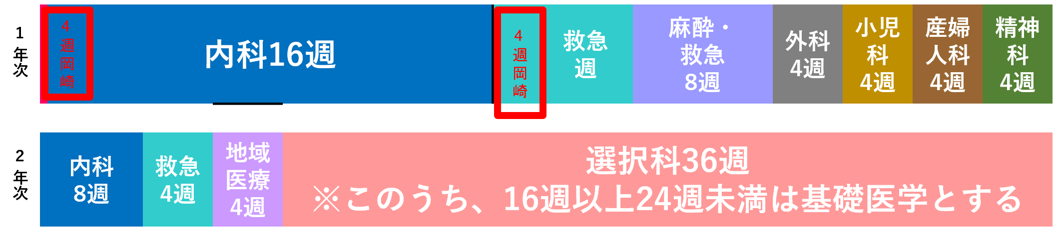 備考2.内科(必修)4週、救急(必修)4週は岡崎医療センターにて行う。