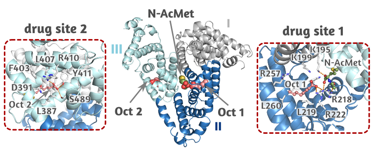 HSA構造中におけるOctおよびN-AcMetの結合部位