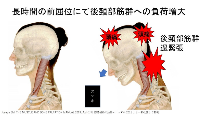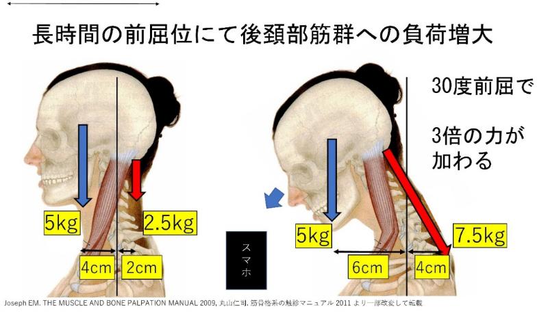 長時間前屈位をとることで、後頚部筋群への負荷が増大し、後頚部筋群過緊張による頭痛が生じます。30度の前屈により後頚部筋群へ通常の3倍力が加わります。