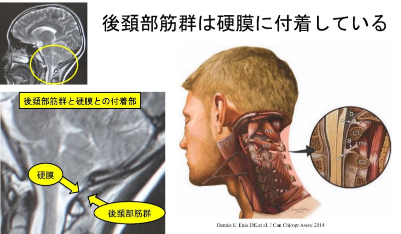 後頚部筋群は頭蓋骨と頚椎の隙間から硬膜に付着しています。