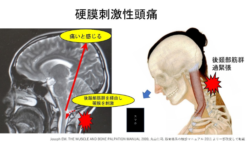 硬膜への刺激により、頭蓋頚椎移行部の硬膜を支配している神経を経由し、脳に刺激が伝わり、痛みを感じます。