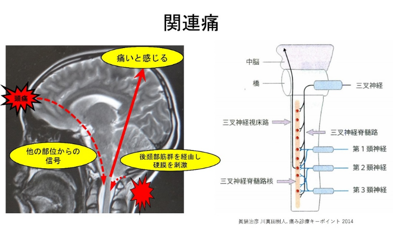 その結果、本当は頭蓋頚椎移行部からの刺激に対する情報だけにもかかわらず、頭蓋骨の他の部位から刺激が来たと脳が誤認し、頭痛が生じます。このような痛みの出方を関連痛と呼びます。