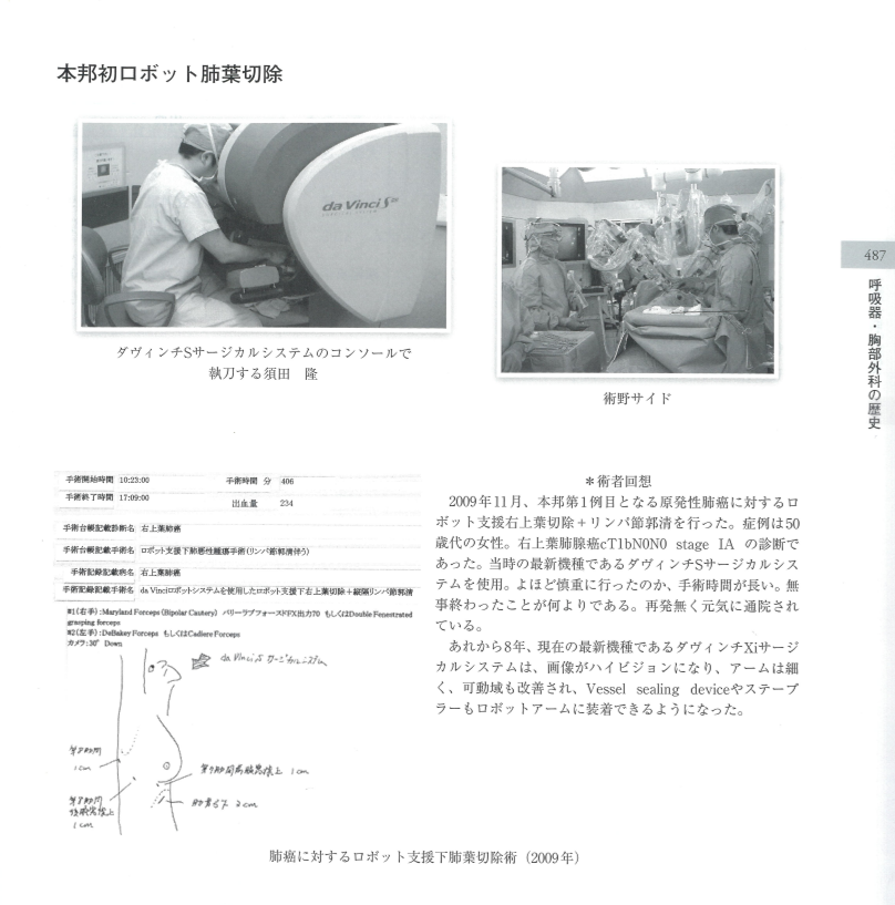 2018年12月「日本胸部外科学会70年の歩み」に呼吸器外科歴史的手術10例の1つとして須田が執刀した2009年の日本初のロボット肺癌手術が選ばれました。