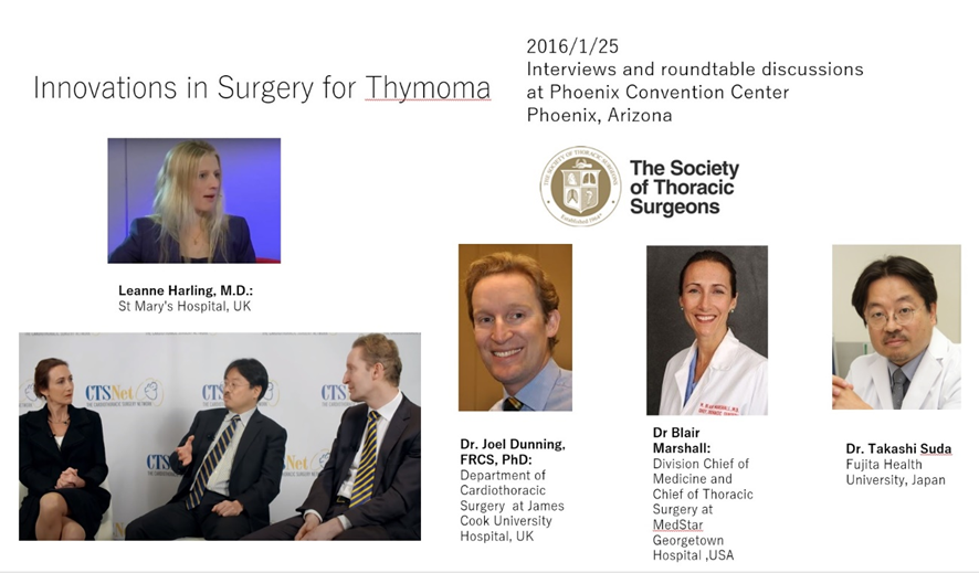 2016年1月25日 米国アリゾナ州フェニックスで開催されたThe Society of Thoracic Surgeonsで胸腺種手術の革新のテーマで世界中から4名(1名欠席)が選ばれラウンドテーブルディスカッションを行い学会のネットワークなどで放映されました。