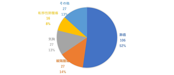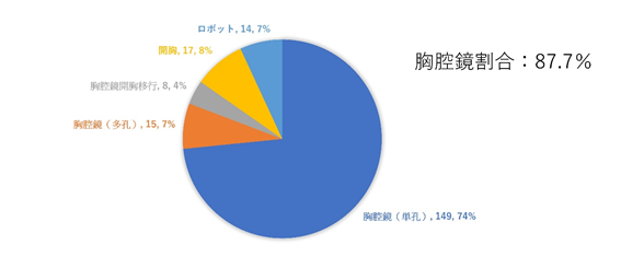 2020年4月7日から2020年12月31日までの手術実績について 2020年4月7日から2020年12月31日までの手術実績について 2020年は4月の開院から12月までに203件の呼吸器外科手術を行いました。その内、肺癌は106件(52%)でした。203件中87%は内視鏡手術であり、単孔式手術は74%、ロボット手術は14.7%でした。