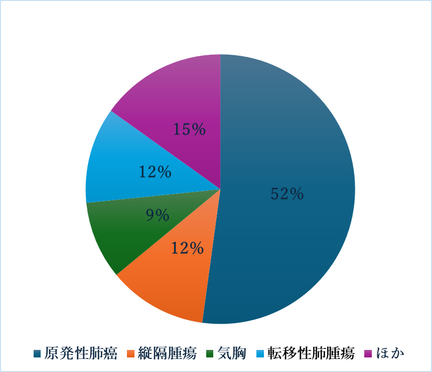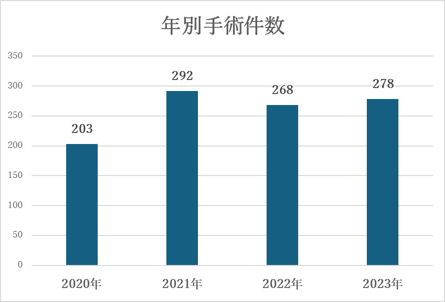 278例の呼吸器外科手術のうち93.5%が内視鏡下(胸腔鏡手術+ロボット手術)に行われ、そのうち単孔式内視鏡手術(単孔式手術+単孔式ロボット手術)は96.5%でした。