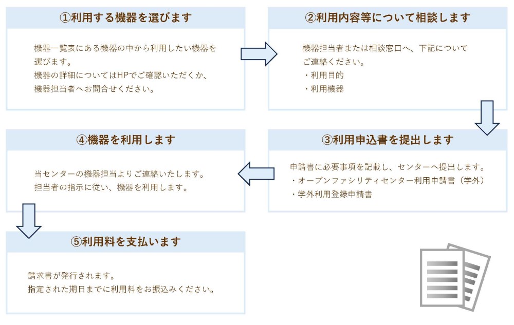 オープンファシリティセンターでは、現在、別表の機器に限り学外の方にもご利用いただいております。