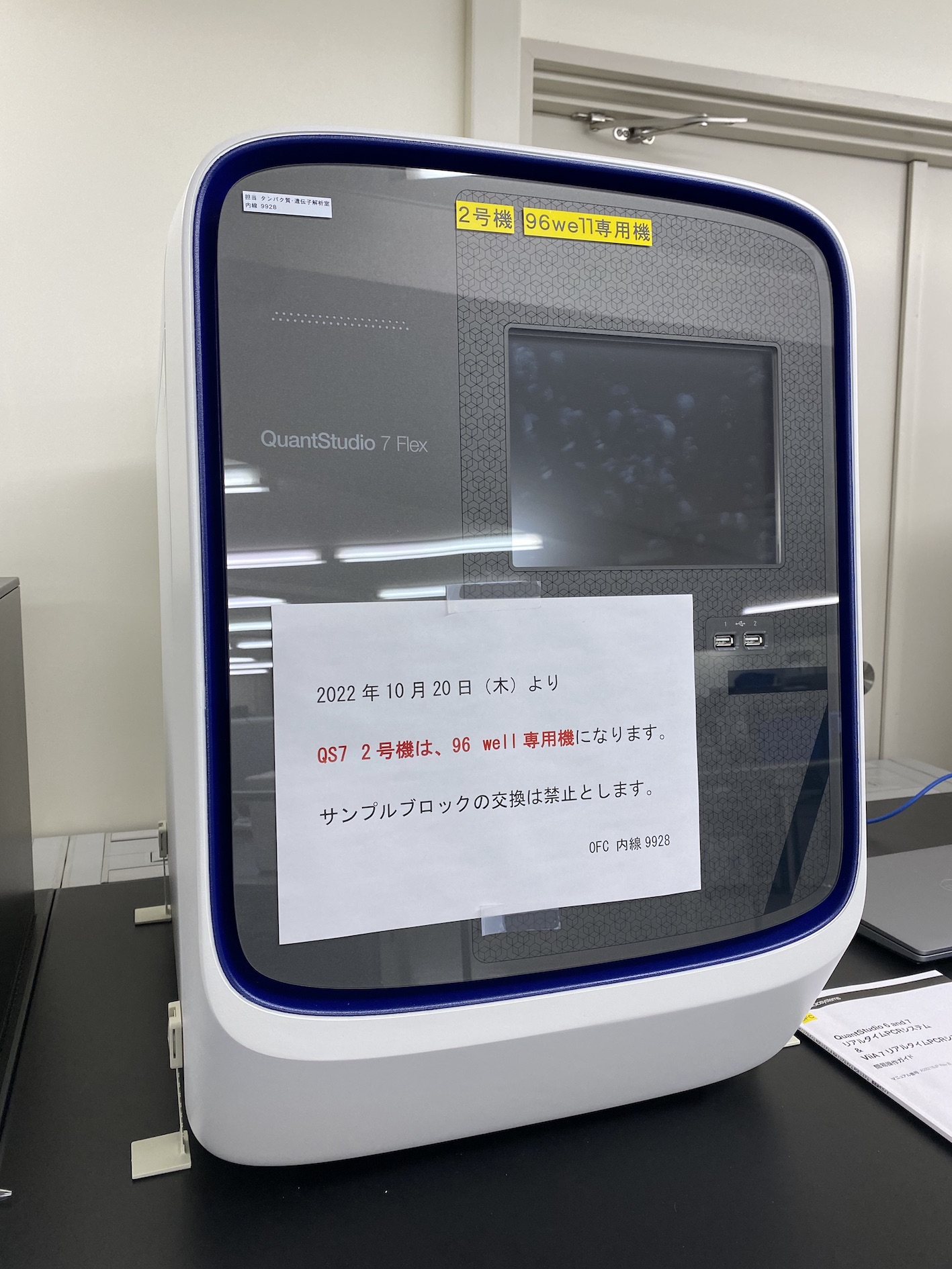 | 備考 | QS7 1号機は384ウェルプレート専用です。 96プレートをご使用の場合は、QuantStudio7 2号機をご利用ください。 ・本機器を利用する際は、必ず機器予約システムにて予約をお願いいたします。 ・ご利用の際は必ず機器に備え付けの利用簿へご記入をお願いいたします。 |