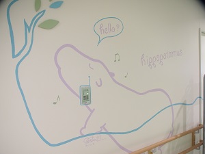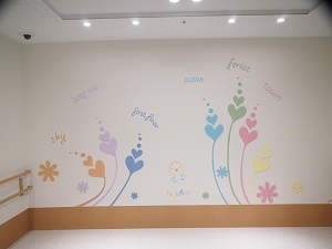 この病棟の特徴はなんといっても特別な装飾が施されていることです。学校、病院、まちづくりなど子どもを取り巻く環境デザインの研究、実践がご専門の、名古屋市立大学芸術工学部、鈴木賢一教授にご協力いただき、内装は病気の子どもたちを和ませる特別なものにしていただきました。この内装のコンセプトは、「ルピナスの花の妖精ルピちゃんが病棟や外来などそれぞれの場所に広がって場所ごとのテーマに沿ったキャラクターをエスコートする」というもので、場所ごとにテーマカラーがあり8階エレベーターホールの「始まりの場所」からラインで繋がって様々なキャラクターを表現しています。このつながりは藤田医科大学病院での絆を象徴している、ということでした。内装の様子を写真でお示しいたします。ラインをたどってどこへつながっているのか追いかけてみたり、イラストの横にある英単語を解読したり、我々でも十分楽しめるイラストが病棟中を飾っており、心和ませる空間となっています。