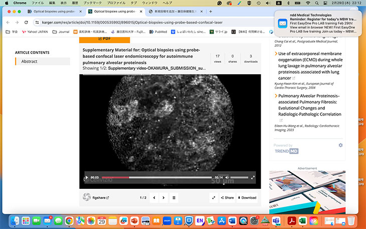 これはプローブ型共焦点レーザー顕微鏡(Cellvizio)による肺胞蛋白症の症例シリーズです。この機器は呼吸器領域で使用できる施設は日本では限られており、初めて私たちがこの機器を扱いはじめたのは8年前です。