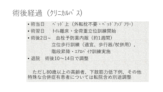 MIS-THAについてはクリニカルパスという術後計画が確立しており、当科では概ね10日から2週間の術後リハビリプログラムを行っています。