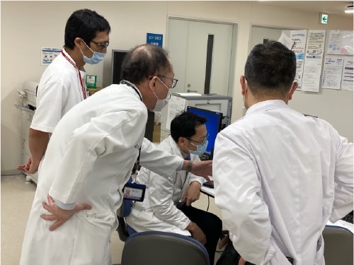 主に若手の消化器内科医師中心に、救急外来で初期研修医が対応した症例をレビューし、ERでは思いつかなかったような鑑別診断からの診断アプローチや、入院後の臨床転帰、背景にある最新エビデンスを議論する「消化器救急カンファ」を隔週で行っており、消化器研修ローテ中以外でも積極的に参加してもらい議論しています。また消化器内科ローテート中に経験した内容を積極的に学会発表する機会を与えています。○○年日本超音波医学会奨励賞を受賞しました。