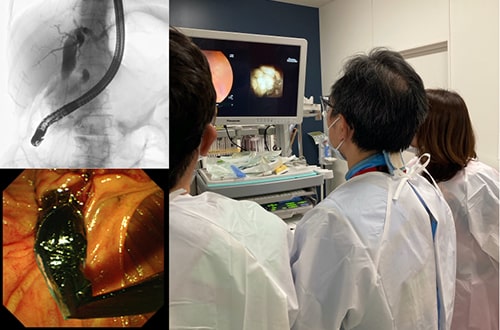 内視鏡を用いて主に胆道系膵臓系の細密検査・治療介入の際に行われる手技です。当科ではERCP関連手技を年623例(2019年度)施行しています。内視鏡手技の中ではいまだに偶発症が多く、一歩誤ると重篤な偶発症を生じてしまう可能性もあるため、大学病院として高度かつ安全な手技に努めています。最近では親子式胆道鏡を用いた診断や治療介入、選択性の高いガイドワイヤーの使用、最閉塞が少なくなることが期待できる胆管内埋め込み型のプラスチックステントや逆流防止機構のついたメタリックステントの使用など、新規モダリティをうまく活用しながらより安全で確実な手技に努めています。