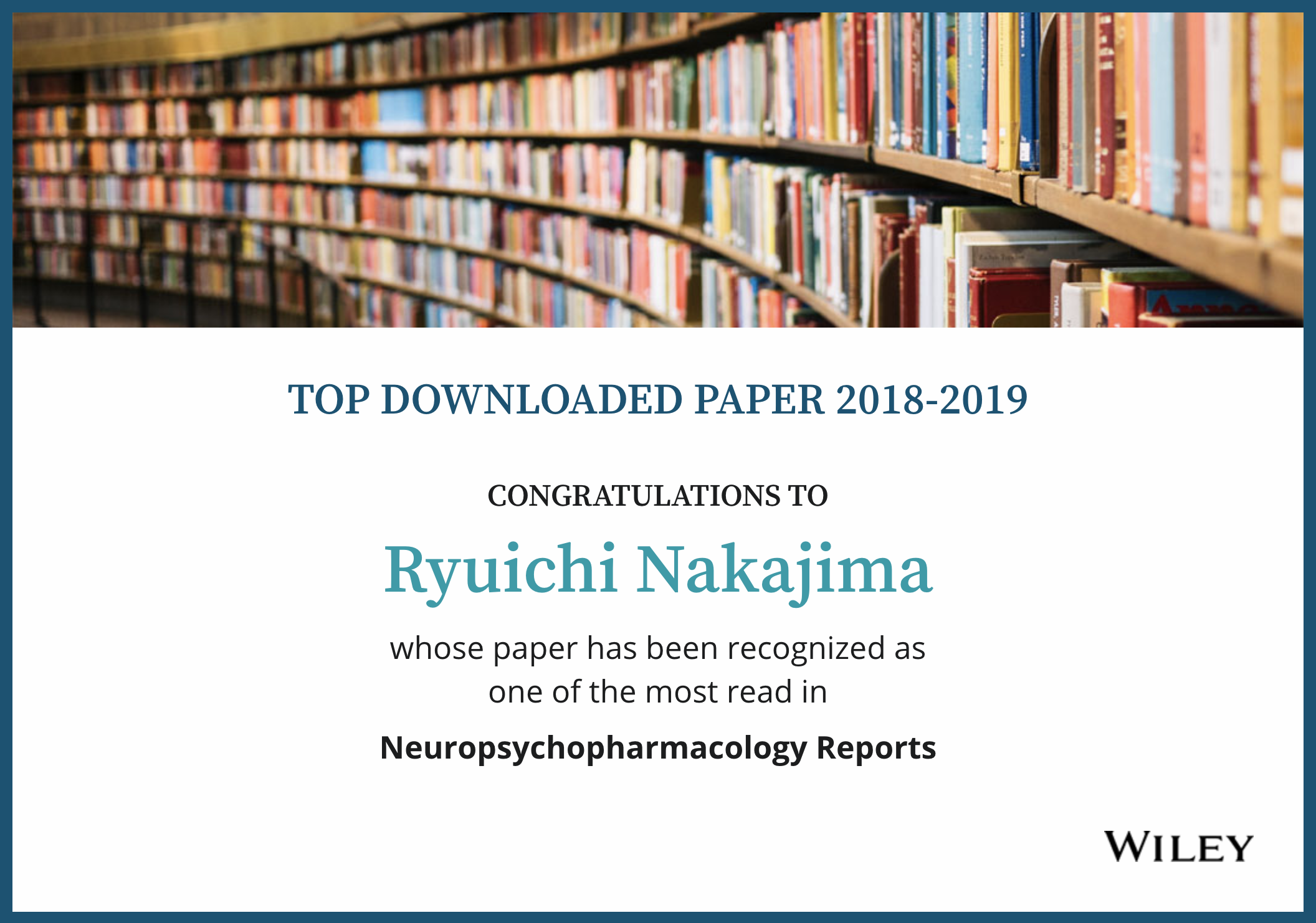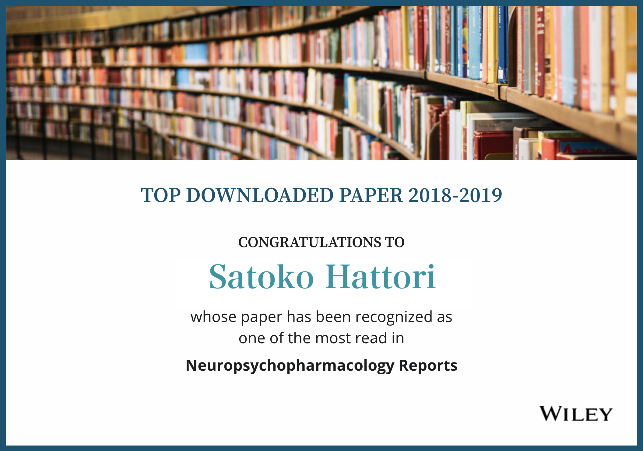 Assistant Professor Takai (Hattori), Assistant Professor Shoji and Research Fellow Nakajima were recognized as the top 10% downloaded papers in the international journal Neuropsychopharmacology Reports.