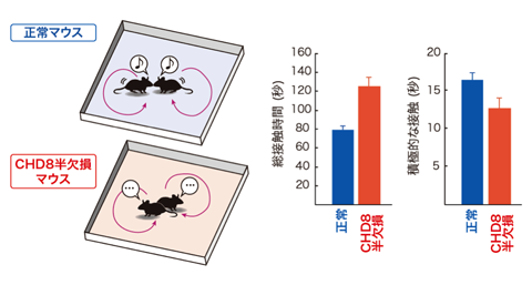 これらの結果から、CHD8半欠損マウスは予想通り、ヒト型の自閉症の特徴を有していると考えられ、CHD8が自閉症の原因遺伝子であると結論づけました。