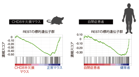 CHD8はクロマチンリモデリング因子であるため、その変異は遺伝子発現に影響することが予想されます。そこで本研究グループは、CHD8半欠損マウスの脳における全遺伝子の発現状態を総合的に調べる技術である「トランスオミクス解析※6」を行いました。その結果、CHD8半欠損マウスにおいて神経発達に重要なたんぱく質であるREST※7の活性が顕著に上昇していることがわかりました。RESTの活性が上昇すると神経発達が障害されることが知られていますが、予想通りCHD8半欠損マウスでは神経発達が障害されていることがわかりました。さらにこのREST活性の上昇は、ヒト自閉症患者の脳でも同様に観察されました(図5)。つまり、REST標的遺伝子量の低下が、実際にヒトの自閉症発症に強く関与していることが示唆されました。