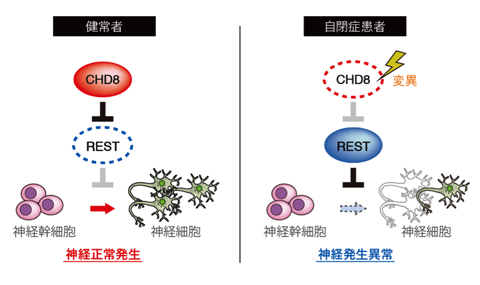 CHD8は神経発達に重要なたんぱく質であるRESTの働きを抑えることによって、胎児期における神経発達のタイミングを調節しています。CHD8に変異が起こると、RESTが異常に活性化することによって神経発達が障害され、その結果自閉症を発症すると考えられます。