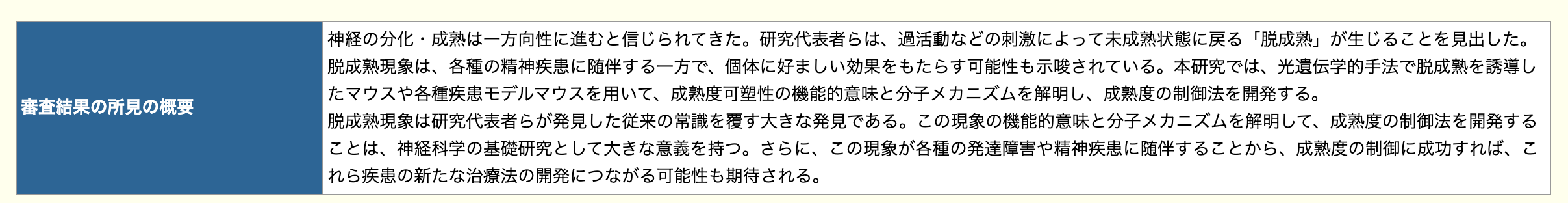 基盤研究(A)(一般)を「脳の成熟度可塑性の理解と制御」の研究課題で採択いただきました。 基盤研究(A)(一般)を「脳の成熟度可塑性の理解と制御」の研究課題で採択いただき、以下のような素晴らしい審査所見をいただくことができました。この現象の研究を進めることにより、各種の精神・神経疾患の克服を目指します。 クリックで画像拡大できます。