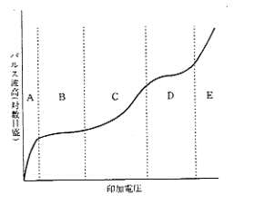 問題 84. 図は気体イオン化検出器の印加電圧とパルス波高との関係を示す。