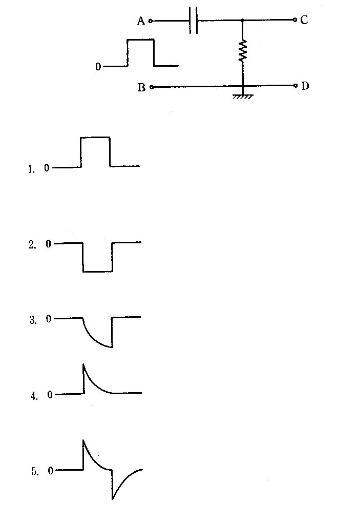1. 5 2. 10 3. 15 4. 20 5. 25 問題 36. 図のような方形パルス電圧をBに対してAに加えるとDに対しCにどのような波形が現れるか。ただし、時定数はパルス幅より小さいものとする。