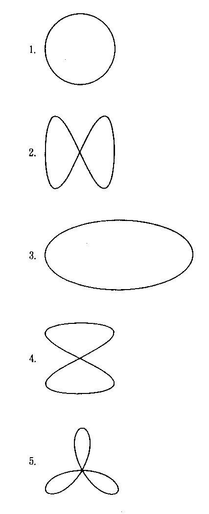 1. 20 2. 21 3. 40 4. 21 5. 50 問題 38. 電解液の抵抗測定に適するのはどれか。 1. テスタ 2. ホイーストンブリッジ 3. 直流電位差計 4. ケルビンダルブリッジ 5. コールラウシュブリッジ 問題 39. オシロスコープの水平偏向板に50Hzの余弦波を加え、垂直偏向板に同じ振幅の100Hzの正弦波を加えたとき、観測されるリサージュ図形はどれか。