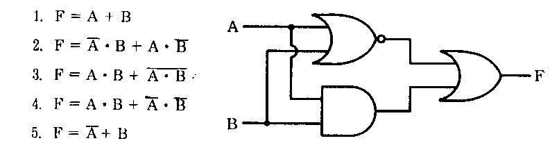 1. 0.25 2. 0.50 3. 50 4. 100 5. 500 問題 42. 半導体について正しいのはどれか。 1. SiにAsを加えた半導体は真性半導体である。 2. N形半導体の不純物はアクセプタである。 3. P形半導体の多数キャリアは電子である。 4. PN接合の空乏層には自由なキャリアが存在する。 5. 金属と半導体とのショットキー障壁接触は整流作用を示す。 問題 43. 正しい組合せはどれか。 a. 電圧効果 ――― ホール素子 b. 整流作用 ――― LED c. トンネル効果 ――― エサキダイオード d. 光起電効果 ――― 光電管 e. ゼーベック効果 ――― サーミスタ 1. a,b 2. a,e 3. b,c 4. c,d 5. d,e 問題 44. 図の回路の論理式はどれか。