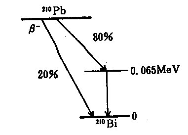 問題 2. ジェネレータの親核種として用いられるのはどれか。 a. 81Rb b. 113Sn c. 68Ga d. 90Y e. 87Y 1. a,b,c 2. a,b,e 3. a,d,e 4. b,c,d 5. c,d,e 問題 3. 放射性核種の分離法で関係のある組合せはどれか。 a. 共沈法 --- スカベンジャ b. 溶媒抽出法 --- 分配比 c. ペーパークロマトグラフ法 --- Rf(移動比) d. イオン交換法 --- 保持担体 e. 電気泳動法 --- 半透膜 1. a,b,c 2. a,b,e 3. a,d,e 4. b,c,d 5. c,d,e 問題 4. γ線計測による中性子放射化分析の特徴で正しいのはどれか。 a. 検出感度が高い。 b. 精度が高い c. 元素の化学的性質に依存する。 d. 非破壊分析が可能である。 e. 多くの元素を同時に分析できる。 1. a,b,c 2. a,b,e 3. a,d,e 4. b,c,d 5. c,d,e 問題 5. 標識化合物の合成法で誤っているのはどれか。 1. 同位体交換法 2. ウィルツバッハ(Wilzbach)法 3. 化学合成法 4. ラジオコロイド法 5. 生合成法 問題 6. 同位体希釈分析法で誤っているのはどれか。 1. 不足当量法 2. イオン交換法 3. 二重希釈法 4. 逆希釈法 5. 直接希釈法 問題 7. ミクロオートラジオグラフィに使用されないのはどれか。 1. ストリップ法 2. 乳剤塗布法 3. コンタクト法 4. イメージングプレート法 5. マウント法 問題 8. 誤っている組合せはどれか。 1. 共沈法 --- 捕集剤 2. 溶媒抽出法 --- 有機溶媒 3. 蒸留法 --- 揮発性化合物 4. ジラード・チャルマーズ(Szilard-Chalmers)法 --- ホットアトム 5. ガスクロマトグラフ法 --- 蛍光体 問題 9. 物理的半減期が8日の標識化合物を投与し、経時的に放射能の体内残存率を測定した ところ、2日後は50%であった。生物学的半減期は何日か。 1. 0.6 2. 1.6 3. 2.7 4. 6 5. 10 問題 10. ^{210}Pb 3.7×10^{4} Bq が毎秒放出する光子数はいくらか。ただし、壊変形式は図に示すとおりである。[図]1. 6.5×10^{3} 2. 7.4×10^{3} 3. 3.0×10^{4} 4. 3.7×10^{4} 5. 4.6×10^{4} 放射線機器工学,最初に戻る