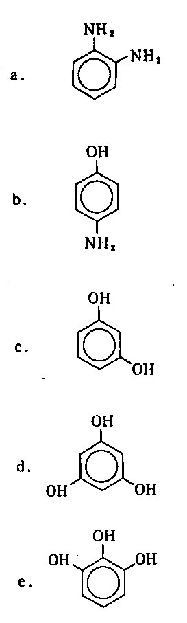 問題 31. 写真効果 E=kIt^{p} で表される現象はどれか。ただし、kを定数、Iを光の強さ、tを露光時間、pをシュワルツシールド(Schwarzschild)の指数とする。 1. 潜像退行 2. 圧力効果 3. 相反則不軌 4. 隣接効果 5. 間欠効果 問題 32. 写真用薬品で誤っているのはどれか。 1. フェニドンは現像主薬である。 2. チオ硫酸アンモニウムは迅速定着液に用いられる。 3. 現像液のpHは定着液のpHより大きい。 4. 炭酸ナトリウムは保恒剤である。 5. 臭化カリウムは抑制剤である。 問題 33. 現像作用のあるのはどれか。1. a,b,c 2. a,b,e 3. a,d,e 4. b,c,d 5. c,d,e 問題 34. 現像液中の亜硫酸ナトリウムの作用で正しいのはどれか。 1. かぶりの発生を抑制する。 2. 現像作用を著しく促進する。 3. 現像主薬の分解を防止する。 4. 乳剤膜の軟化を防止する。 5. 溶液中の酸素を還元除去する。 問題 35. 写真濃度について正しいのはどれか。 1. 全濃度から支持体着色濃度とかぶり濃度を引いたものを正味濃度という。 2. 特性曲線上の適正露光部の傾きをラチチュードという。 3. 間欠露光の方が連続露光より低濃度になることをアルバート効果という。 4. 過度の露光によって濃度が減少し画像が反転することをベクレル効果という。 5. 濃度0.3とは透過光が入射光の30%になることをいう。