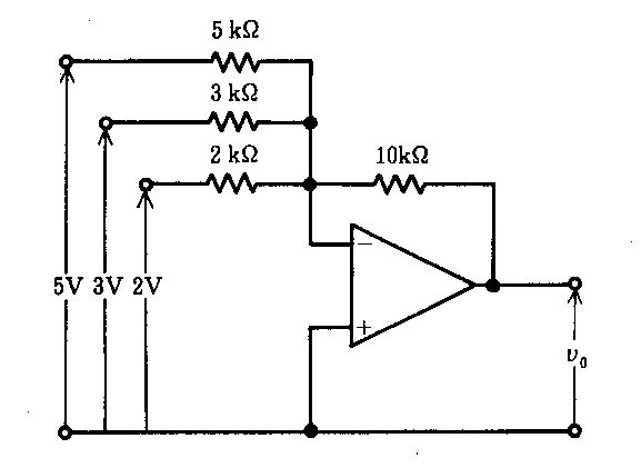1. 0.37 2. 0.63 3. 0.74 4. 1.26 5. 2.00 問題 38. オシロスコープについて誤っているのはどれか。 1. 電圧の時間的変化が直接観測できる。 2. 電力の時間的変化が直接観測できる。 3. リサージュ図形が描出できる。 4. 交流の周波数測定ができる。 5. のこぎり波状の電圧を水平偏向板に加える。 問題 39. 誤っている組合せはどれか。 a. 可動コイル形計器 --- 直流専用 b. 可動鉄片形計器 --- 交流専用 c. 電流力計形計器 --- 交直両用 d. 整流形計器 --- 直流専用 e. 熱電形計器 --- 交流専用 1. a,b 2. a,e 3. b,c 4. c,d 5. d,e 問題 40. SCRについて誤っているのはどれか。 1. 増幅作用がある。 2. アノード、カソード及びゲートの端子をもつ。 3. サイリスタの一種である。 4. スイッチング回路に使える。 5. pn接合を3個もつ。 問題 41. 誤っているのはどれか。 a. ダイオードは整流作用をもつ。 b. ホトダイオードは逆方向の電圧を加えて光を当てると発光する。 c. pn接合の空乏層は順方向の電圧を加えると増大する。 d. 半導体は温度が上がると抵抗値が低下する。 e. 発光ダイオードはpn接合に順方向の電流を流すと光を出す。 1. a,b 2. a,e 3. b,c 4. c,d 5. d,e 問題 42. 図の回路の出力電圧v0は何Vか。[図]