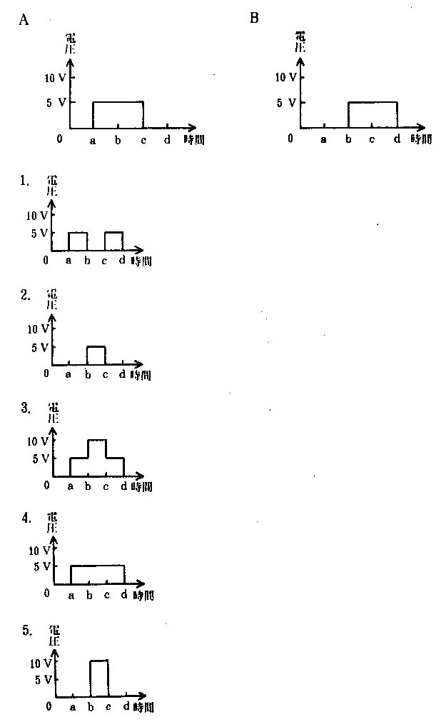 1. 1 2. 2 3. 10 4. 20 5. 100 問題 35. 相等しい3個の抵抗を星形に結線し、これを線間電圧200Vの三相交流電源に接続したとき、10Aの線電流が流れた。1個の抵抗値は何Ωか。 1. 6.67 2. 11.5 3. 20.0 4. 34.6 5. 60.0 問題 36. 平衡三相負荷に200Vの対称三相電圧を加えたとき、全電力は2.4kW、全無効電力は3.2kvarであった。三相皮相電力は何kVAか。 1. 1.0 2. 1.3 3. 1.6 4. 2.8 5. 4.0 問題 37. 図(A)で表される電圧を図(B)のab間に加えたとき、流れる電流iの最大値は何Aか。[図]