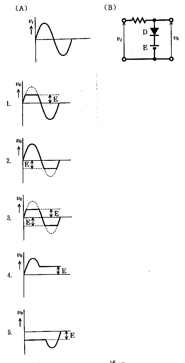 1. ツェナーダイオード 2. トンネルダイオード 3. ホトダイオード 4. バラクタダイオード 5. 発光ダイオード 問題 41 負帰還増幅回路で誤っているのはどれか。 1. 増幅度は低下する。 2. 電子部品の経時変化による変動を減少させる。 3. 出力の雑音を低下させる。 4. 入力インピーダンスを変換できる。 5. 周波数帯域を狭くする。 問題 42 正弦波(A)を回路(B)に入力したとき、出力波形v0はどれか。